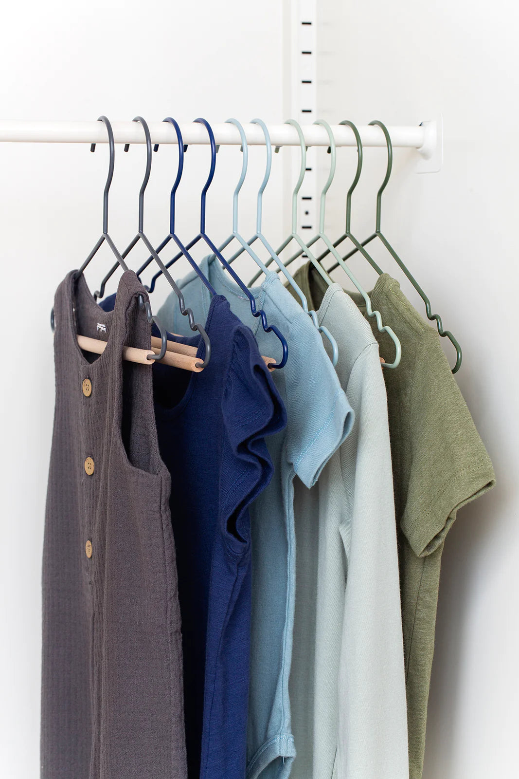 The Hangers come in packs of 10 and fit perfectly inside The Skinny and The Twinny. They come in all 12 colors, or you can pick a bundle in two fun color themes: Summer (Mustard, Berry, Blush, Lilac and Chalk) and Winter (Olive, Sage, Ocean, Navy and Slate).
