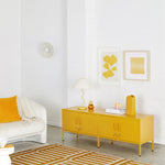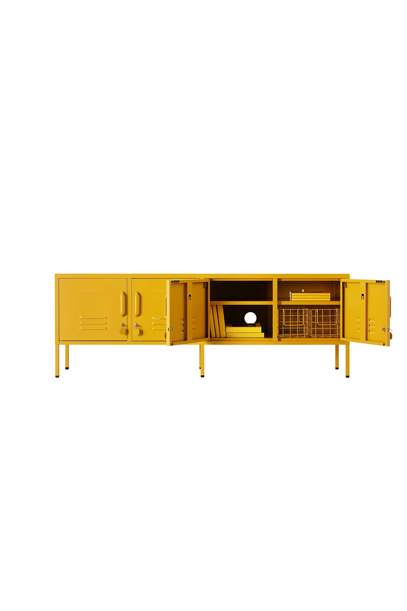 Inside, you'll find four adjustable shelves and a handy hook inside each door. On the outside, you'll find two cable holes, two wall attachment points, four lockable doors, custom key rings, air vents and a subtle embossed 'mustard' on each door, to let you know it's the real deal. Plus, the whole locker is smooth, matte and magnetic! Screens don't always do our colors justice — order a swatch to see how it looks in your space